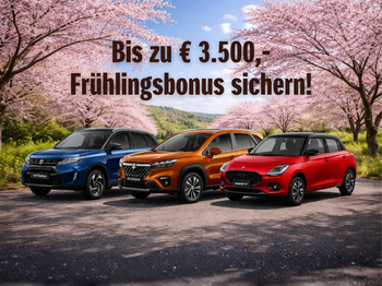 - Frühlingsbonus SWIFT 1) Kundenvorteil am Beispiel Modell Suzuki SWIFT 1.2 GL HYBRID clear von € 2.500,- besteht aus € 750,- Kaufvertrag-Bonus, € 750,- Finanzierungsbonus, € 500,- Versicherungsbonus und Händlernachlass. Finanzierungsbonus gültig bei Abschluss einer Finanzierung (Mindestlaufzeit 36 Monate) über Suzuki Finance – ein Geschäftsbereich der Toyota Kreditbank GmbH Zweigniederlassung Österreich. Versicherungsbonus gültig bei Abschluss eines Suzuki Versicherung Vorteilssets (bestehend aus Haftpflicht, Vollkasko, Insassen- und/oder Rechtsschutzversicherung), Mindestlaufzeit 36 Monate über GARANTA Österreich Versicherungs-AG. Aktion gültig für Privatkunden bei Kaufabschlüssen und Anmeldung bis 31.05.2026 oder solange der Vorrat reicht. Bei allen teilnehmende Suzuki Händlern.