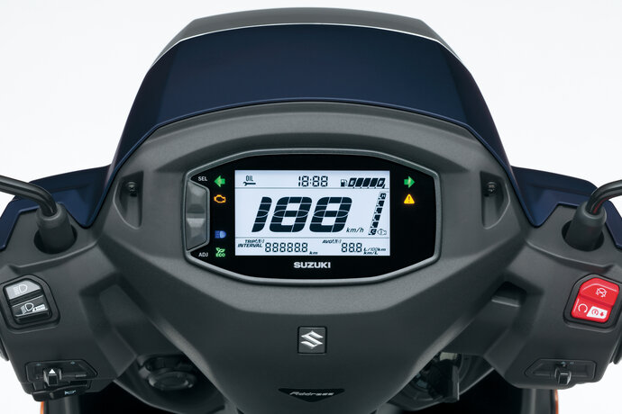 Neues 4,2-Zoll-LC-Display, Suzuki Easy Start System, zwei Staufächer, Gepäckhaken sowie ein USBA-Ladeanschluss runden die hochwertige Ausstattung ab.