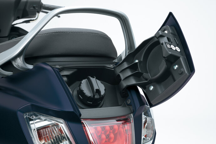 Der Tankverschluss befindet sich jetzt im Heck unter einer eleganten Abdeckung und wird bequem per Zündschlüssel geöffnet - ganz ohne Hochklappen der Sitzbank. Das Tankvolumen erhöht von 5,0 auf 5,3 Liter.