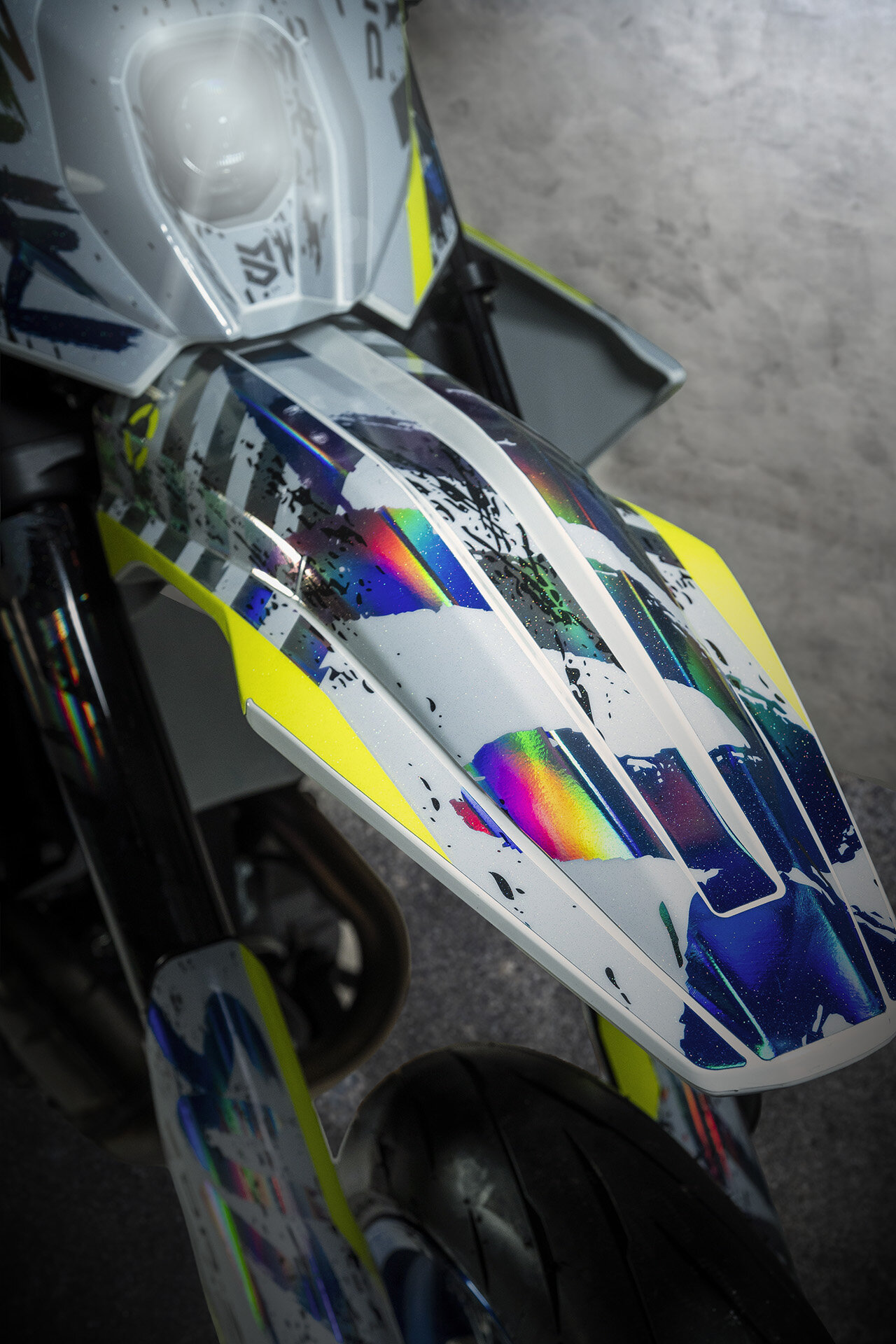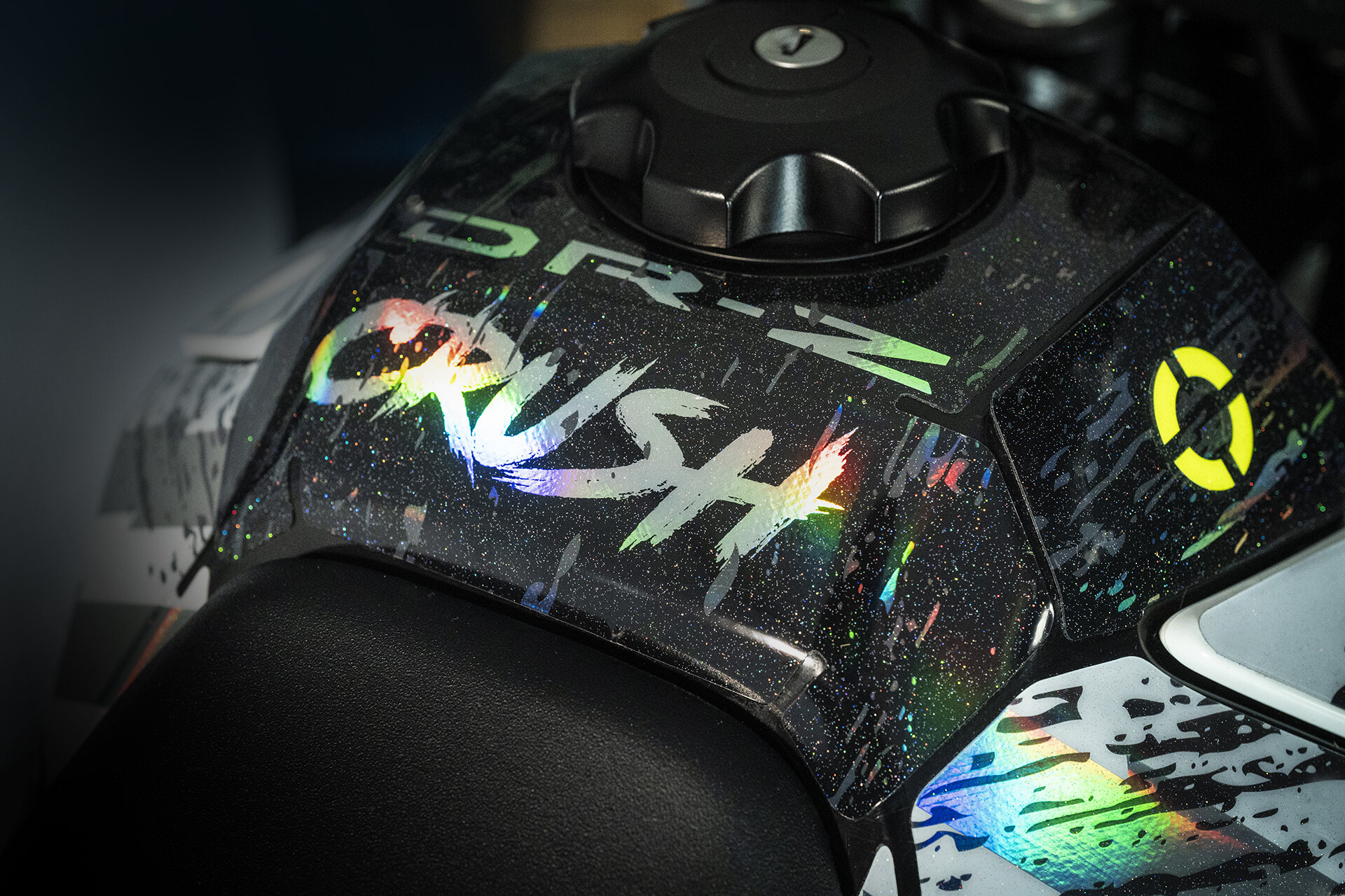 Zusatz-Highlight: DR-Z4SM „CRUSH“ Sticker-Kit Variante. Als extra Styling-Option gibt es „CRUSH“ für die DR-Z4SM – kein Sondermodell im klassischen Sinn, sondern ein optionales Sticker-Kit als zusätzliche Farbvariante. Der Look wirkt wie ein „Paint-Splash“ in Bewegung.